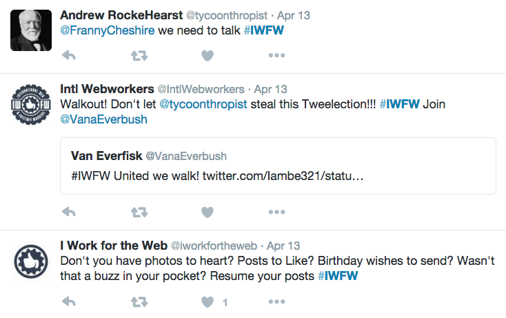 In April of 2015, students in “The Future of Fiction” participated in a “netprov” called “I Work for the Web.” Netprov is a genre of Twitter fiction involving collaboration and improvisation. Read about our involvement in #IWFW here.